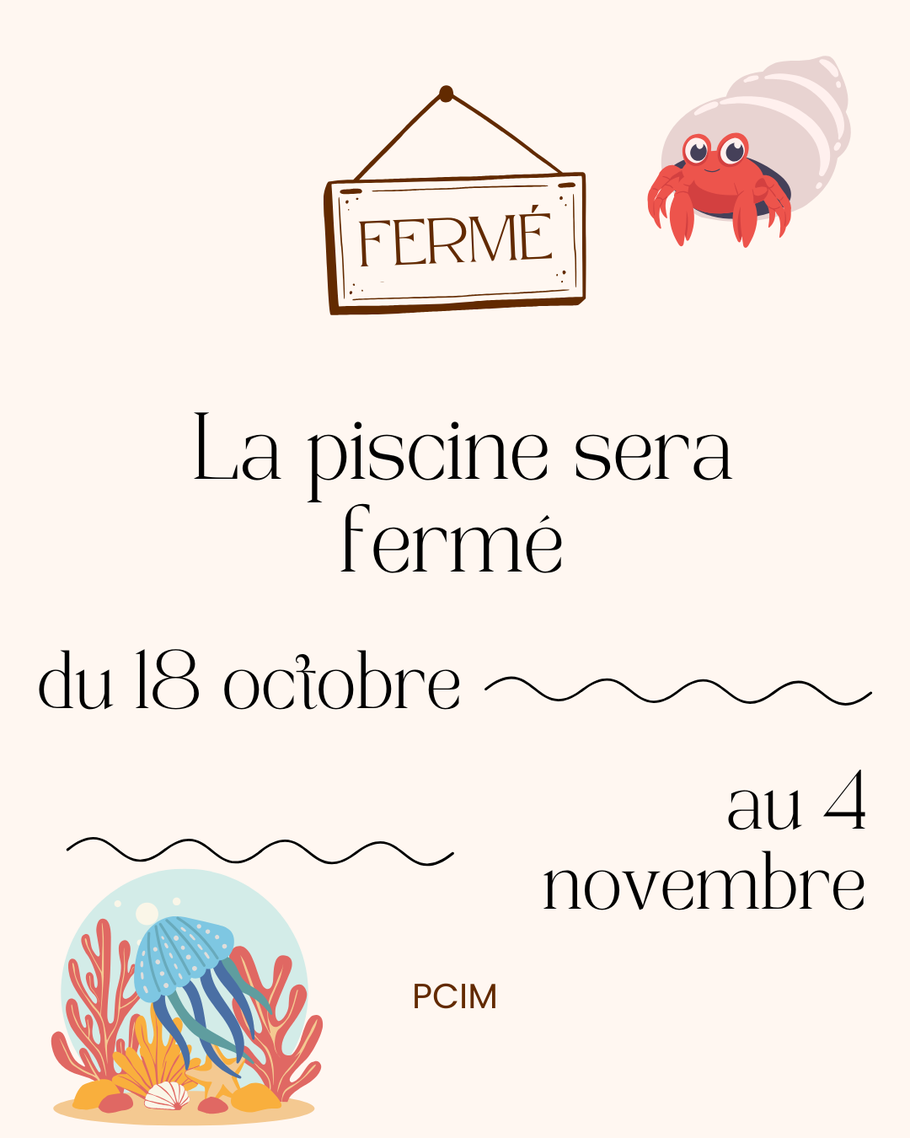 Fermeture de la piscine pour les vacances de la Toussaint, de Noël, de Février, de Pâques et pendant les grandes Vacances.